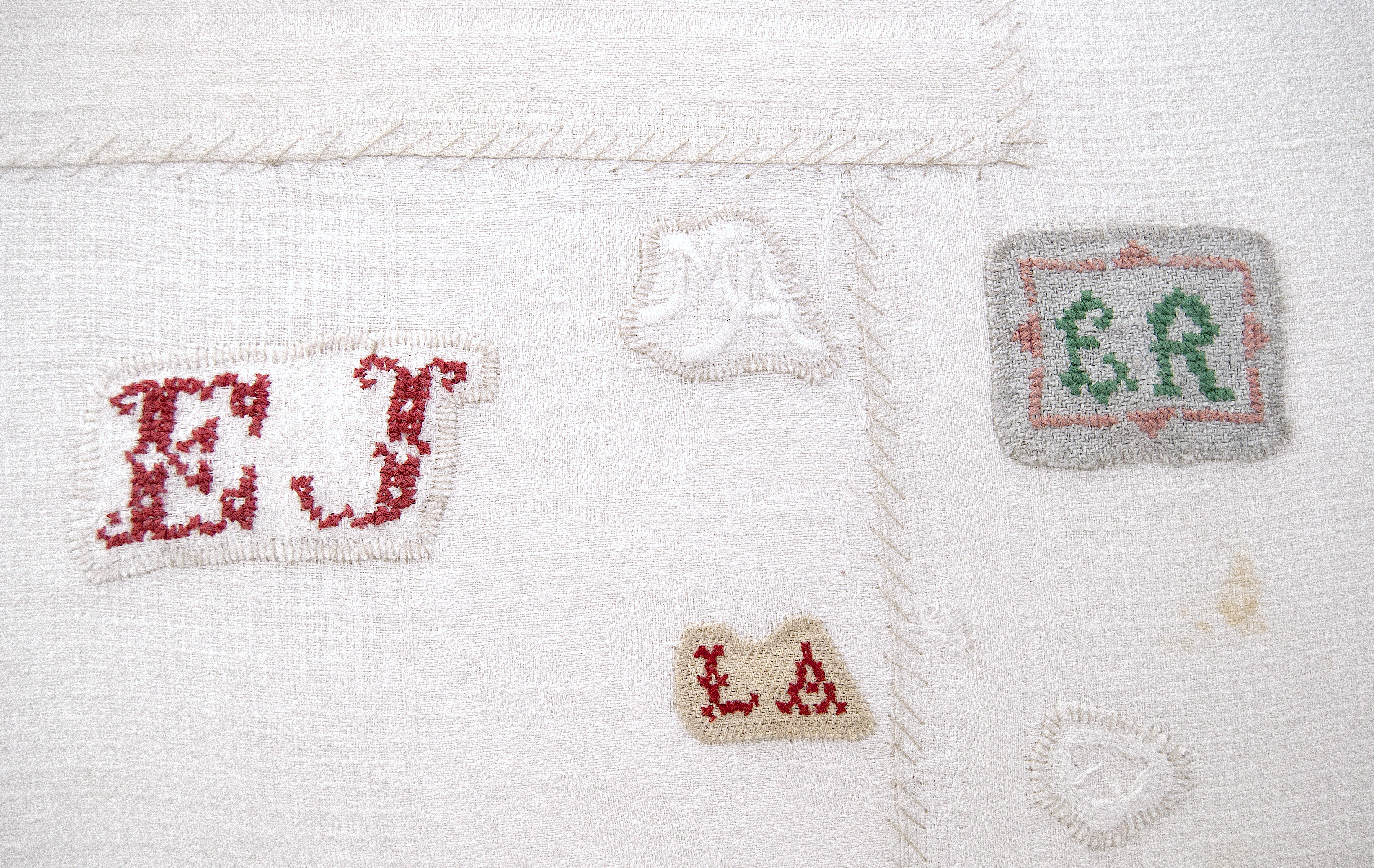 Handbroderi, textilt collage av begagnade äldre kökshanddukar med monogram. 90 x 65 cm